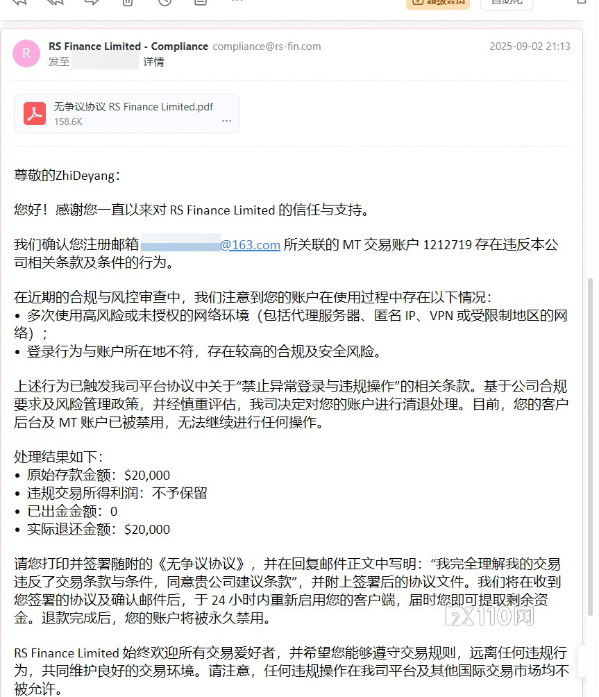 我在RS Finance进行交易,入金20000美金盈利了21687.02美金,准备去出金的时候发现账号被封禁,紧接着就是邮件发现有一封邮件说我账号因为IP地址经常变动怀疑我使用了VPS,然后要扣除我的盈利。我实在是费解为什么不能使用VPS进行交易,平台的规则也没有说啊。
