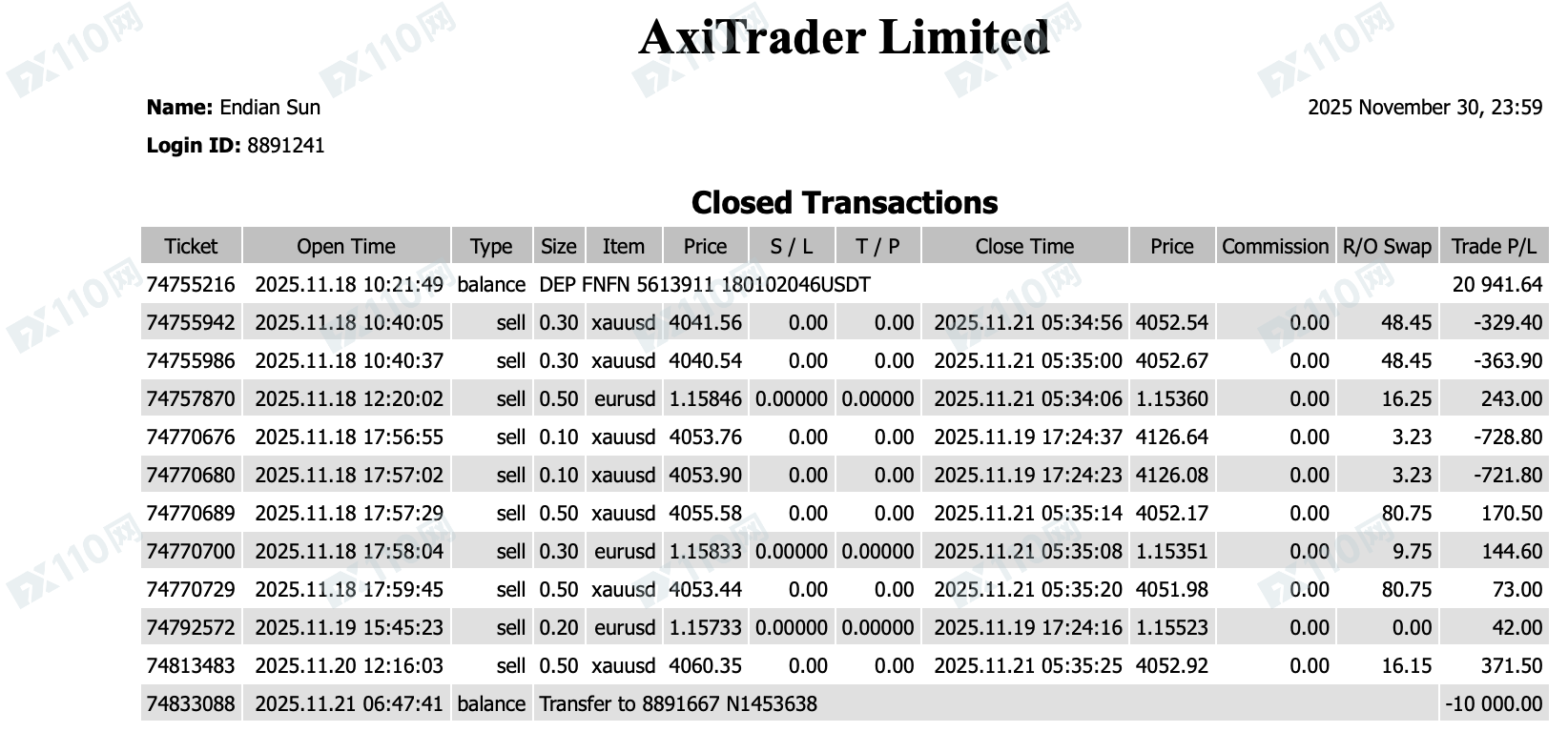 )注册客户,注册邮箱louis679990@outlook.com,相关账户8891667,8891241。本人在2025年11月17日注册开户,并在11月18日入金20941.64美元并进行交易