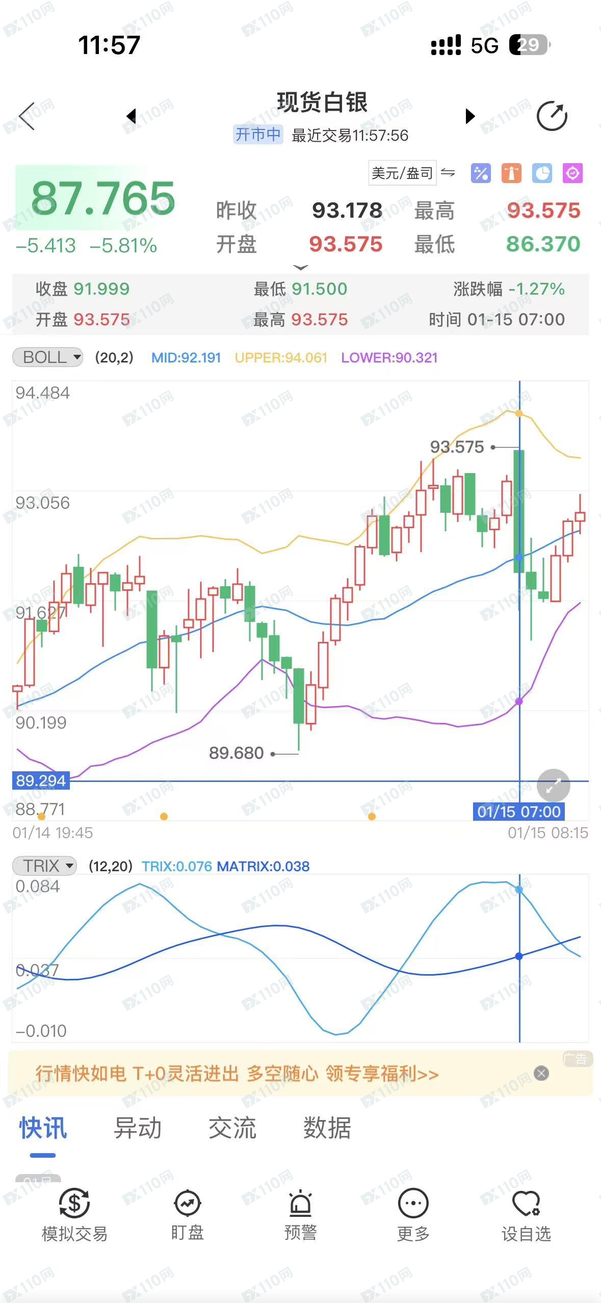 本人撰写此说明时为北京时间 2026 年 1 月 15 日 11:30,当前国际市场伦敦银价格为 87 美元/单位。本人该笔白银空单的开仓均价为 91.5 美元/单位,共计 14 手,按照当前国际实时价格计算,该笔订单本应盈利 近30 万美元。
