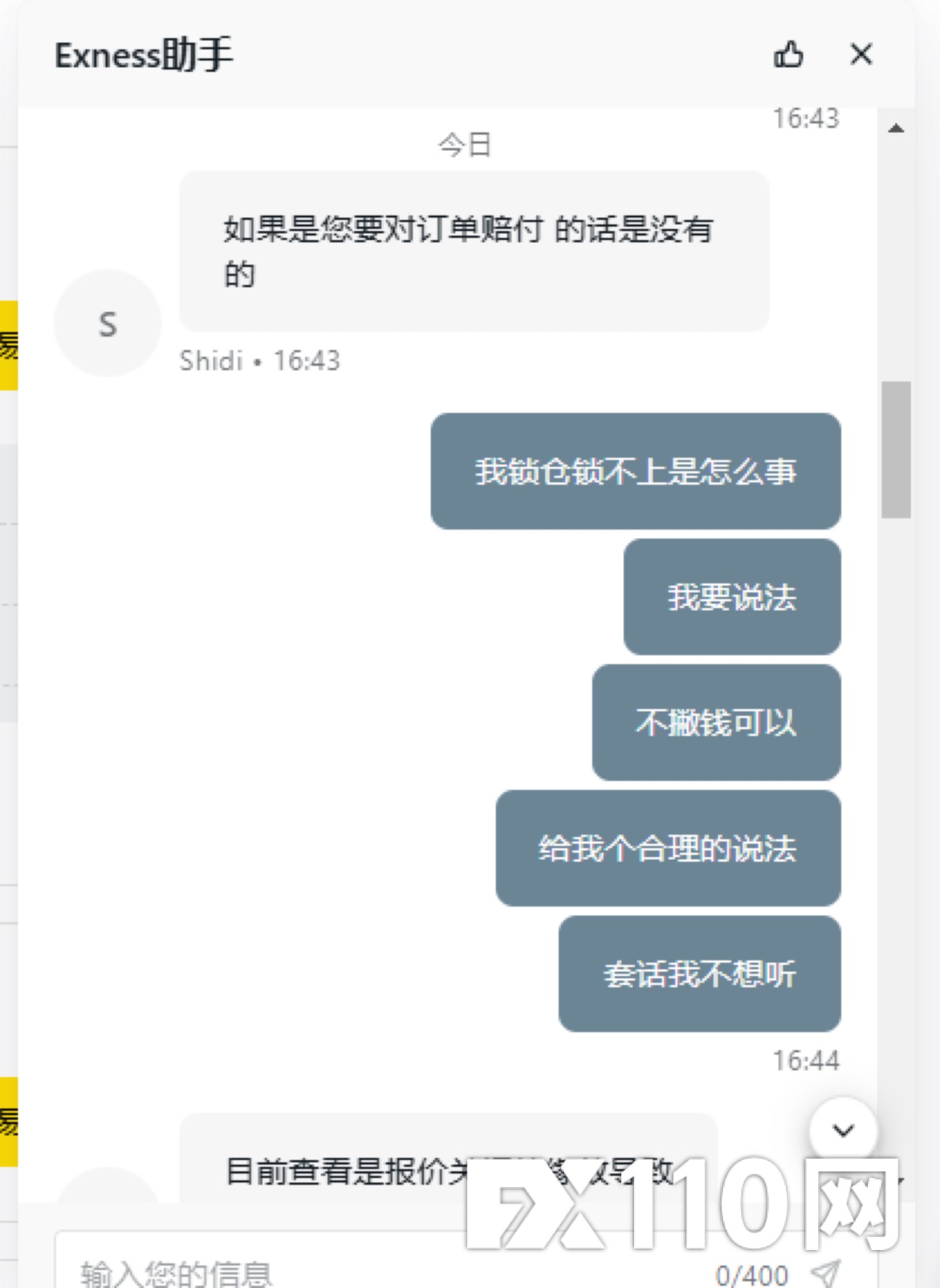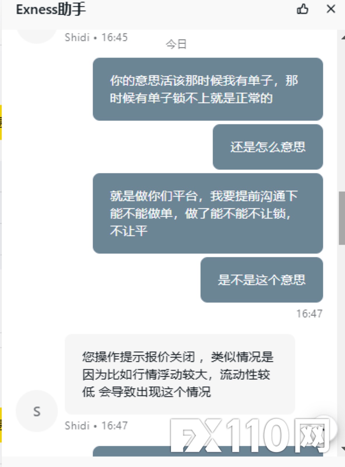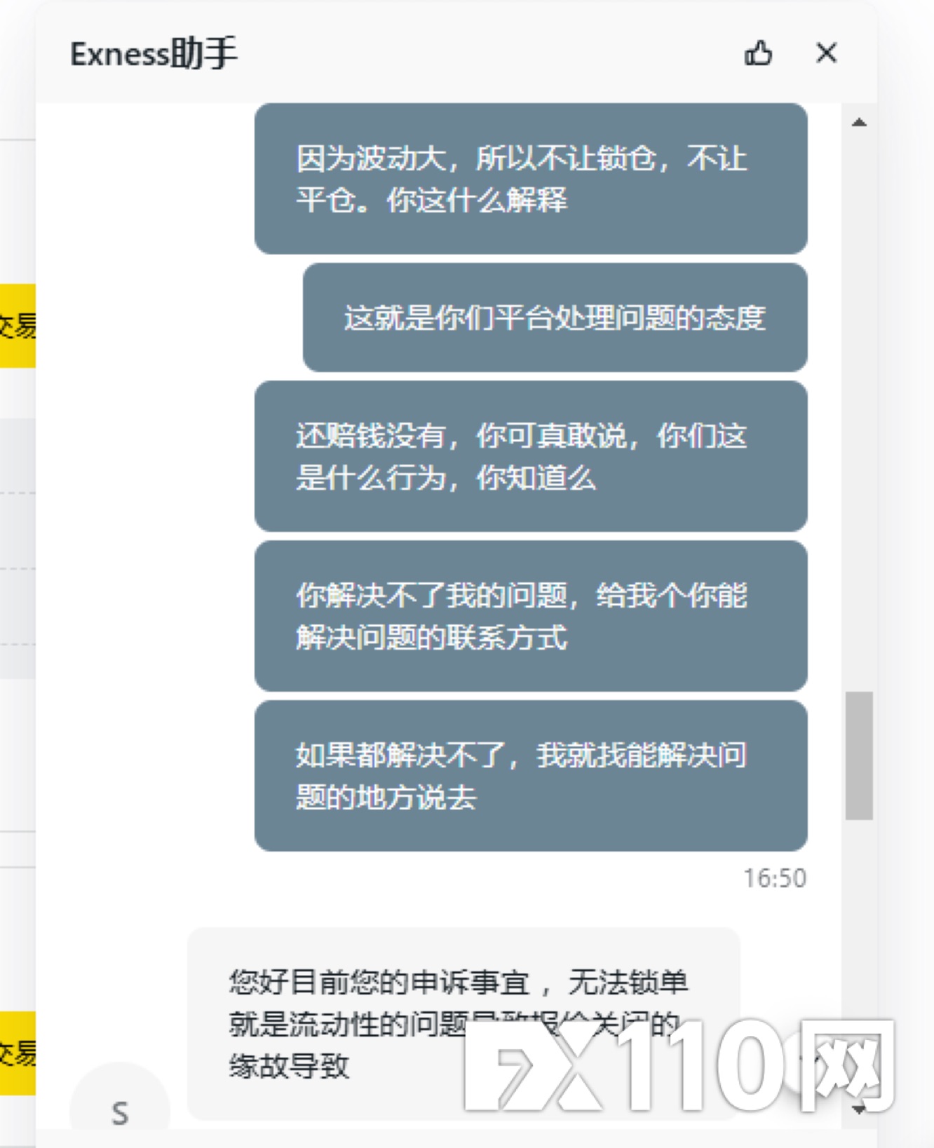 进单后,不能锁仓不能平仓,平台给的回复是那时间浮动大不能锁仓平仓是正常的。单子能不能平要平台决定这样的平台还怎么做,这和抢有什么区别。就算是撮合成交,单量不大,多委托几次,单子也一样会平出去或锁上。他这平台这纯欺负人呢。希望能帮忙反馈下,赔付我的损失。下图是我向exness平台申诉后给我回复的邮件,还有和客服的记录。