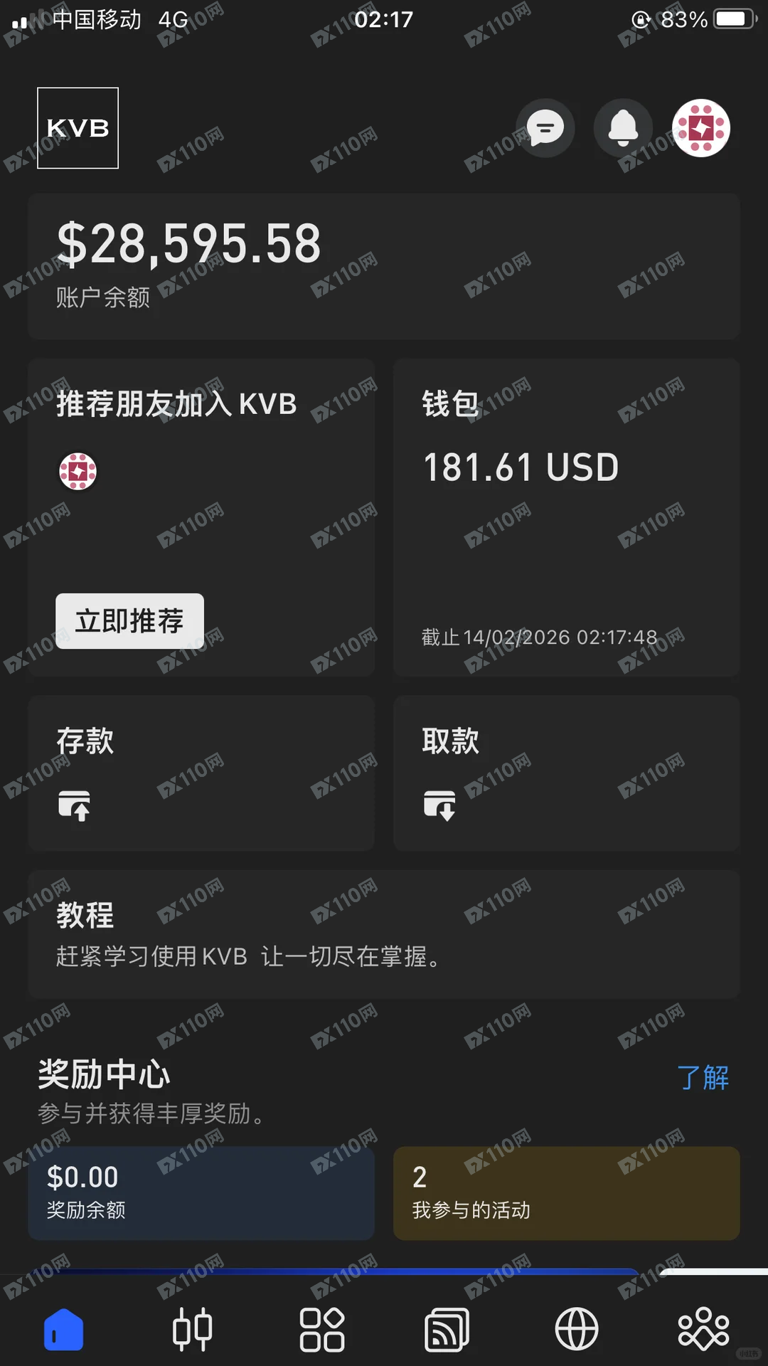 本人在kvb平台操作过一段时间,春节时候出金5200美金,顺利到账了,隔了一天再出4000多美金直接给我退回来了,再登录后台提示账号被删除了。。。尝试把180美金佣金出来提示账户异常。联系客服,跟我说会有人联系我,我还想看看他们编啥理由,因为我只会正常的手工单(附上了原图),所以不怕他们说什么违规交易,等了两天啥也没等到,连个邮件都没有,关键我本金还在里面,听说过黑平台,没听说过连本金的都吞的缺德平台