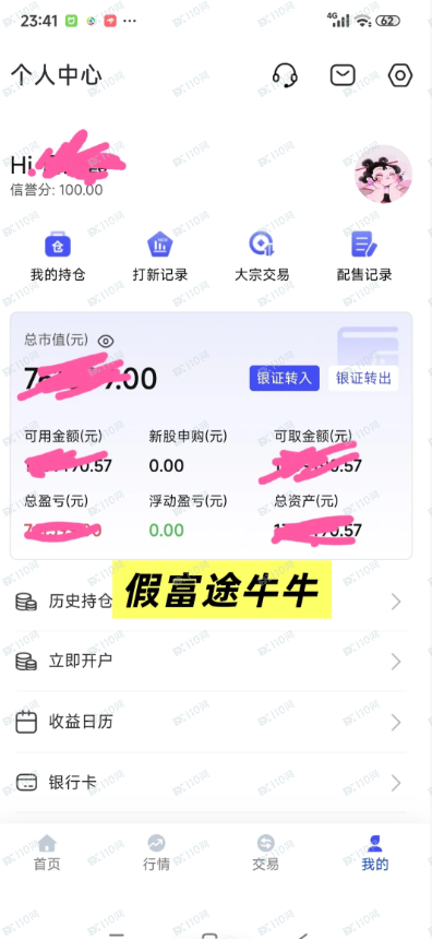 大家小心啊,我已经被骗60个了,前段时间炒股亏了几万,就在别人评论区吐槽了一下,就被骗子精准钓鱼了。骗子获取信任后,推荐了假冒的富途牛牛商劵app,这个假商劵的优势是打板容易买进第二天吃溢价。我脑袋被驴踢了就下载注册了。跟着炒了一段时间确实很好用,后面就是骗子精心布局了,说想过个肥年就买配售股,然后去申请果然中签12000股,30多万,但是已超预算了,需要补交10多万,没钱了,骗子就让我去网贷,等我交齐后,骗子又说这个配售股行情不稳定,最好马上回购。但是回购需要缴纳百分之20的保证金,这时我已经深陷进去了,他让我做啥我就做啥。保证金缴纳完毕后我申请提现,这时又显示需要缴纳盈利的百分之20个人所得税。这时我已经无能为力了,但是还没醒悟。骗子说他先帮我垫10w,我自己出3w,后面还给他,但是他不用自己银行卡,就转到其他3个人的卡里,到这里就结束了,因为骗子收到钱后彻底失联!!!刚好2个月时间,让我损失60个!后知后觉报案了!我知道自己很愚蠢!!!