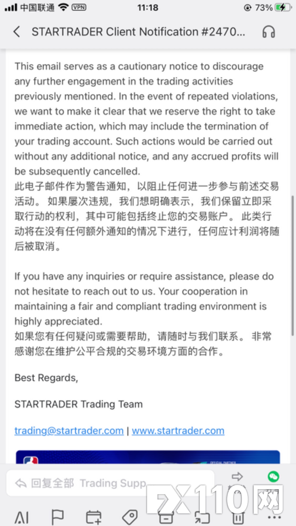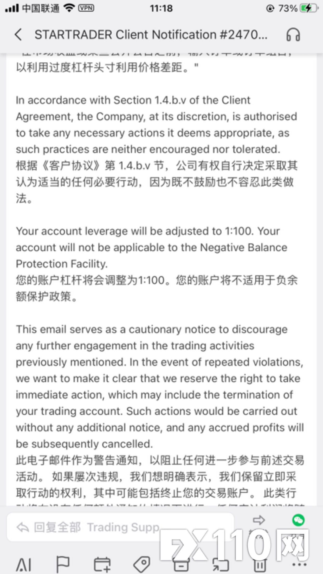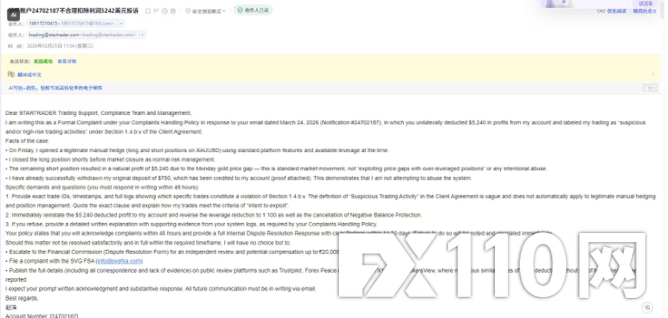 3月24日平台突然发送邮件(Notification #24702187),指控我进行“可疑和高风险交易活动”,引用《客户协议》Section 1.4.b.v,称我在市场收盘前利用过度杠杆利用价格差距,单方面扣除全部5243美元利润,只剩本金750美元。同时将杠杆调整为1:100,并取消负余额保护。 我已于3月25日发送正式书面投诉邮件,要求平台提供: