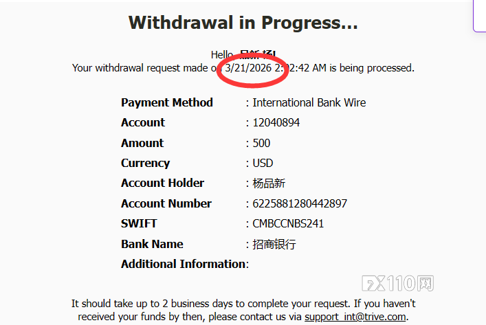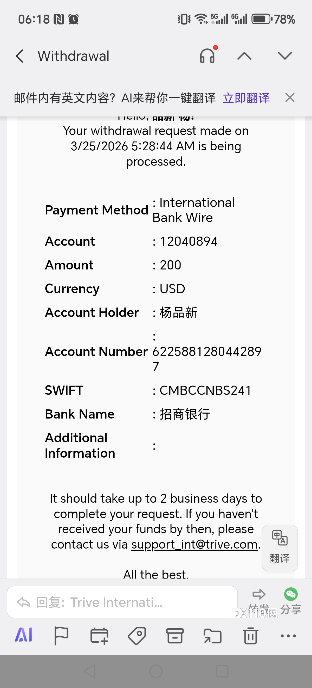 投诉单号:204104 投诉平台:Trive 投诉类型:出入金问题 维权诉求:索还交易资金 维权金额:1,000 美元 投诉进度:处理中