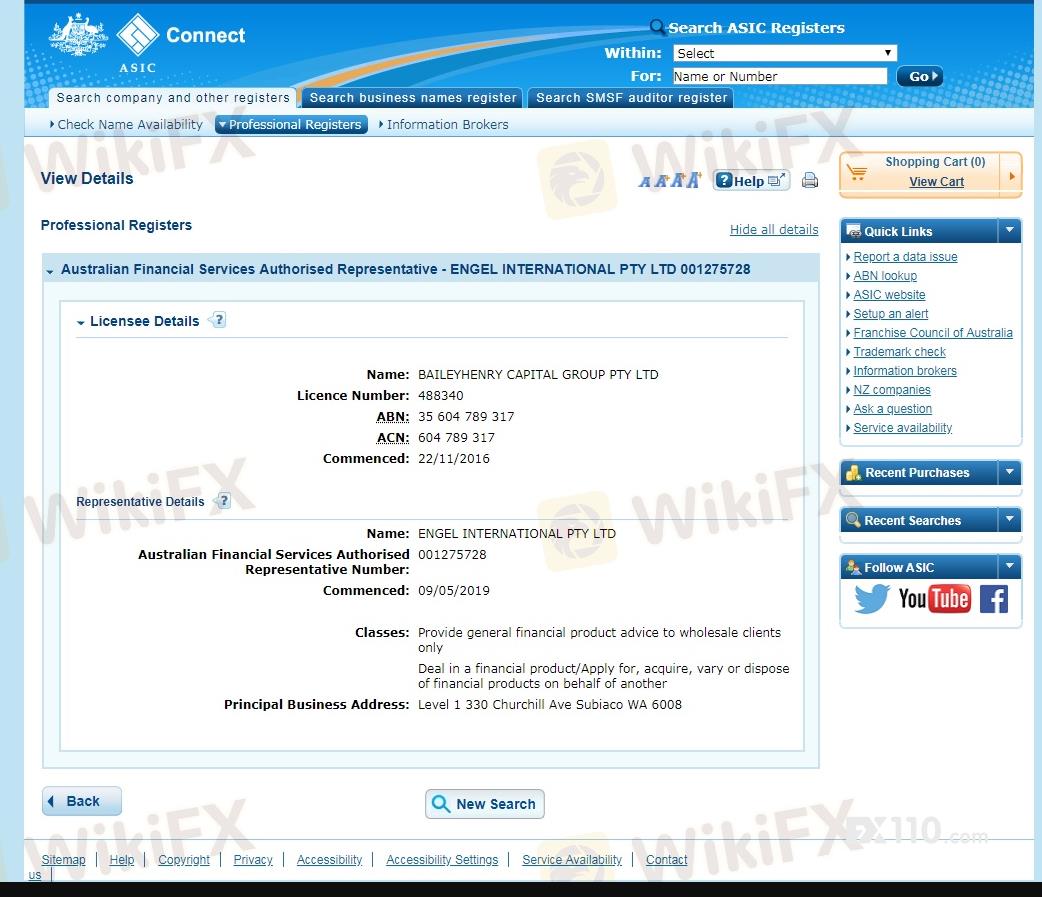 Engel FX平台网址域名成立时间为2019年10月8日,时间较新。该平台宣称受美国NFA和澳洲ASIC AR001275728监管,澳洲公司注册为:ACN604 789 317。经查询,在澳洲ASIC官网输入“001275728”,查无任何结果,查询澳洲ACN604 789 317对应平台名称为BAILEYHENRY CAPITAL GROUP PTY LTD。在美国NFA官网输入“Engel FX”和“BAILEYHENRY CAPITAL GROUP PTY LTD”,均查无任何结果,显然该平台为虚假宣传!