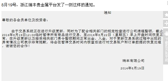 瑞丰平台在2014年8月18日晚上23点篡改了我的操作,导致了我爆仓。 并且连当日的交易记录也被篡改。在8月19日突然发出公告说整顿在,当月22日(也就是8月22日)内完成出金。可是在8月20号截止目前为止(9月16日),银行账户内仍然没有收到资金,而交易平台上显示的余额为0。