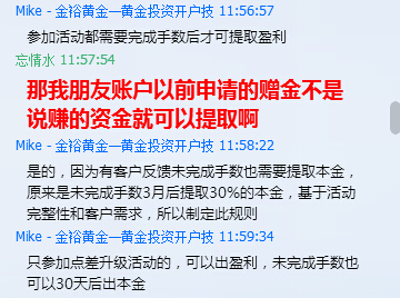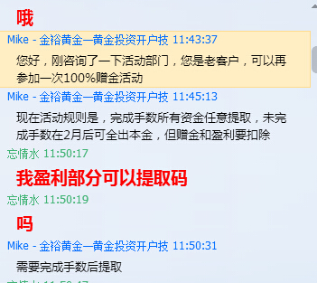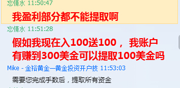 该公司客服入金以前说只需要入金100美金就送100美金,且盈利部分可以自由提取,无需交易手数限制,但是当我入金后,再次联系客服得到的回答是,现在交易规则改了,需要达到一定的手数才能提取盈利部分。本金需要扣留2个月才让出金,且不知道是否还让出金。希望通过维权能让我尽快出本金。