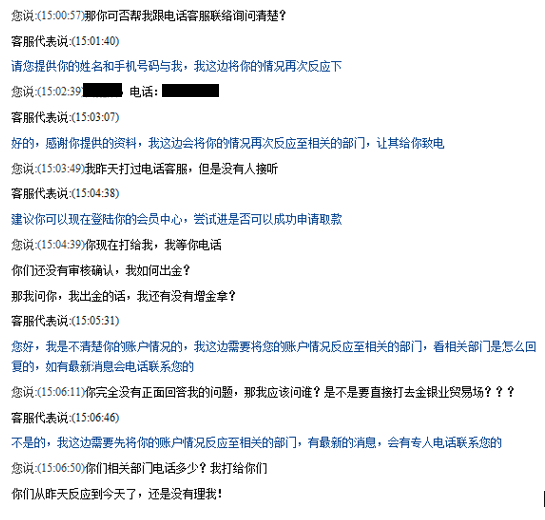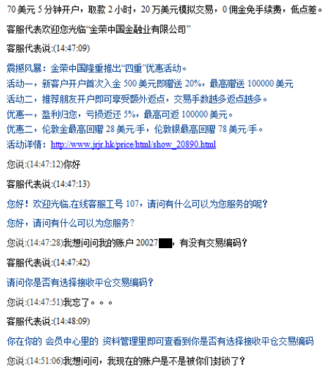 本人姓黄,于2015年2月3日在「金荣中国金融业有限公司」开户,入金10万美元,当日起开始进行伦敦金交易,交易账号为20027xxx。但2月25日下午想下单时,却发现账户突然被封锁,无法交易,更不能出金!2月26日,本人希望通过合法途径挽回自己的损失,于是通过电话以及一封投诉信的方式,向监管机构曝光「金荣中国」这种性质恶劣的违法违规行为。