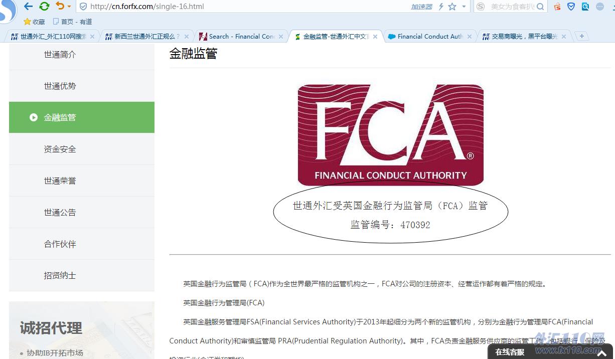 该平台主页http://cn.forfx.com/index.html,在我刚接触这个平台的时候,客服告诉我世通外汇受新西兰金融监管牌照,监管编号289185,网站cn.forfx.com要我做代理,现在这个平台又说受英国FCA监管,监管号是470392,我在110客服的协助下查询FCA网站发现该监管号是一家叫FinotecTradingUKLimited的公司,并不是世通。经过110协助查找得知,他们新西兰的监管已经过期了,英国监管也是套牌。