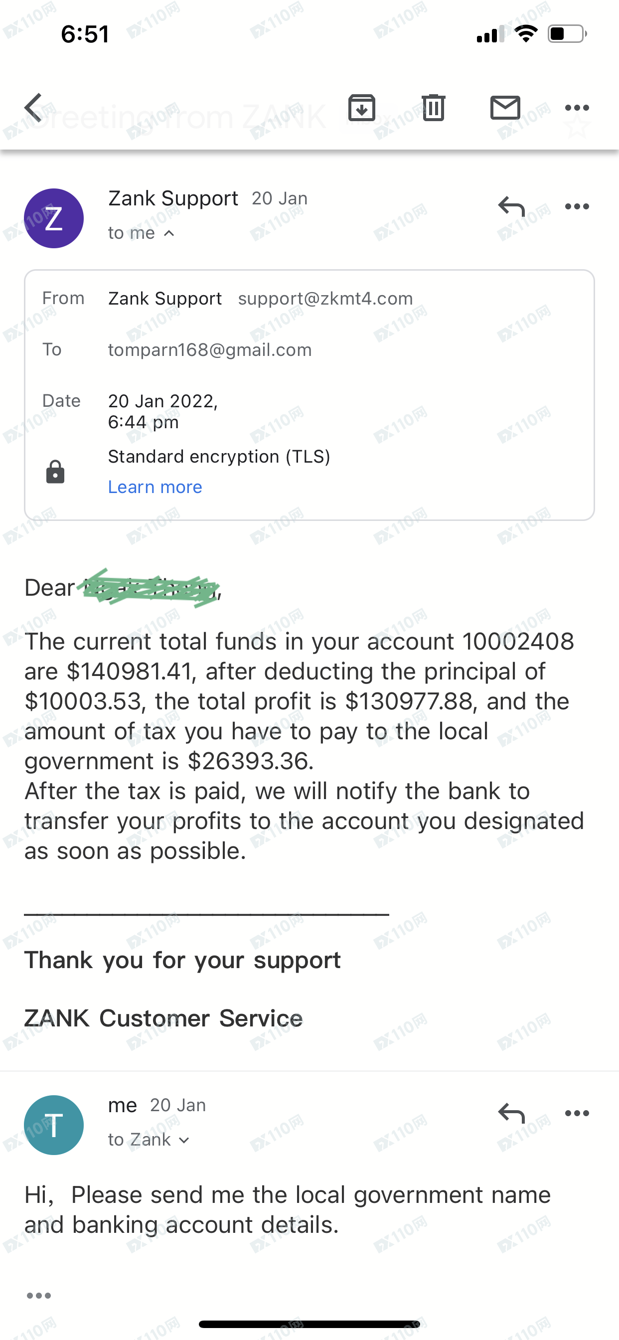 我在 Zank (Zank International Ltd) 的 MT4 交易经纪人进行投资。我的账户是盈利的,我想提取资金,然后这个经纪人一直要求我提前向他们支付额外的税款,以便我提款。我已经告诉他们从我的账户中扣除任何经纪人费用和税款,但他们不同意这样做。甚至认为我要求他们退还他们一直忽略的我的投资资本基金。这是一个骗局,我被这个经纪人欺骗了。请注意并尽可能远离这个诈骗经纪人。一旦你的钱进去了,你就拿不回来了。zankcapital.com、zkmt4.com 或 zankmt4.com 所有虚假网页都会导致对投资者的误导和欺骗行为。