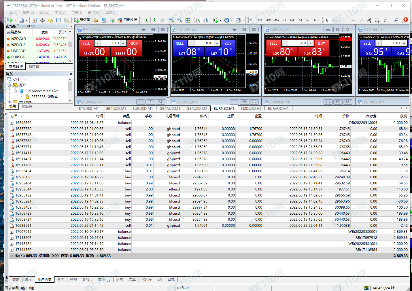 本人 交易账户2879386 ,5月13日入金2000美元 盈利869.33美元 全部不给出金 CPT是诈骗公司 以下有入金证明 交易记录