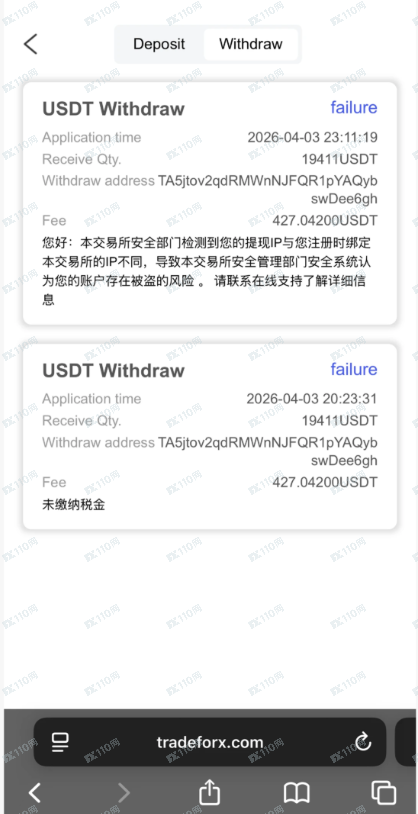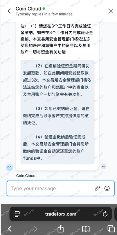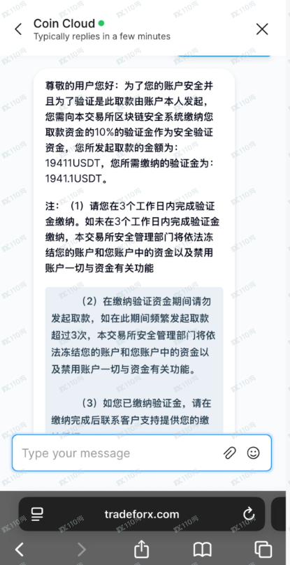 直到提现的时候我才发现有问题:第一次提现不成功是因为没交税金,后面这比所谓税金打到了coin cloud客服的钱包,并截图且发了身份证给他,然后我就开始第二次提现,但也是失败,原因是现实ip地址不对,需要交安全验证金才行,这时候才发现已经晚了,因为我的u都在这个虚假的网站上,