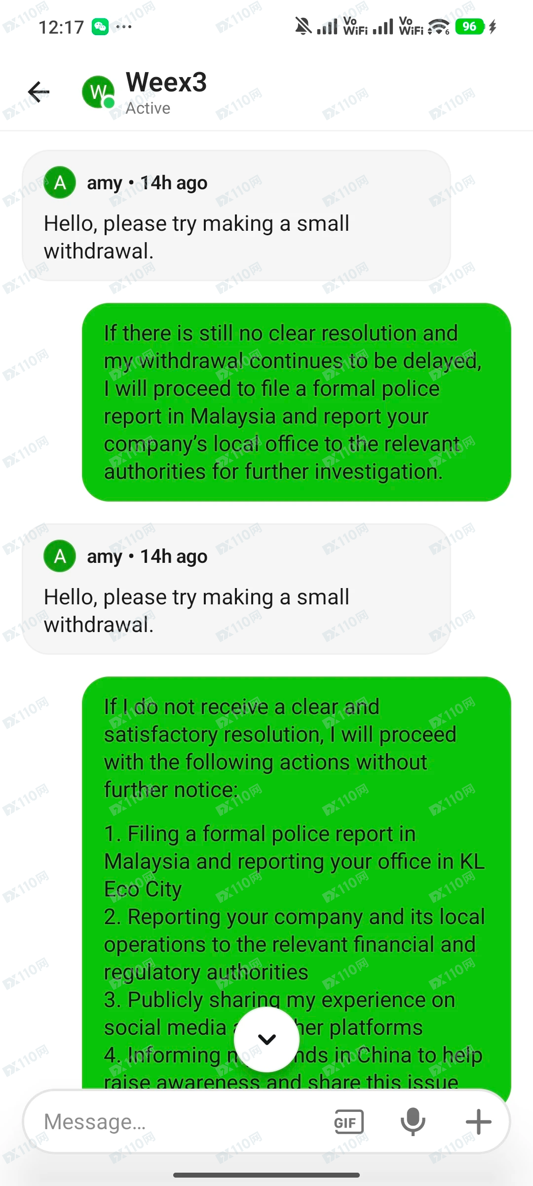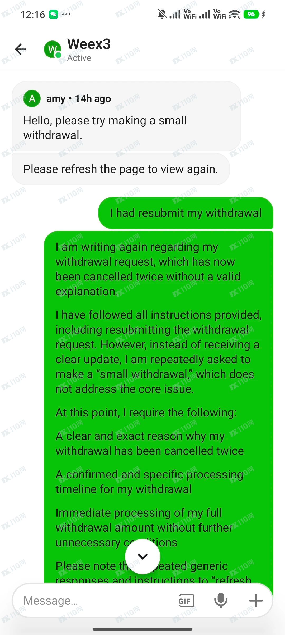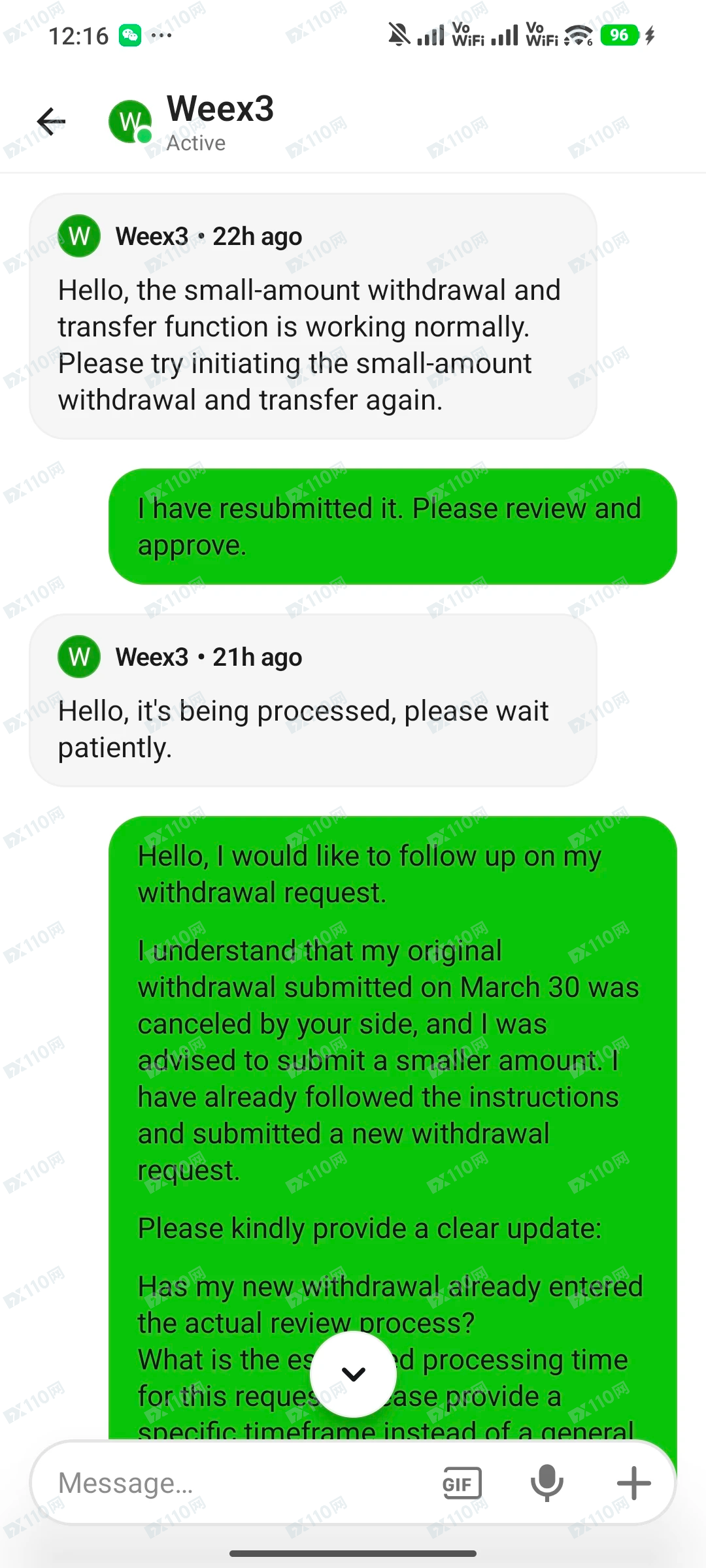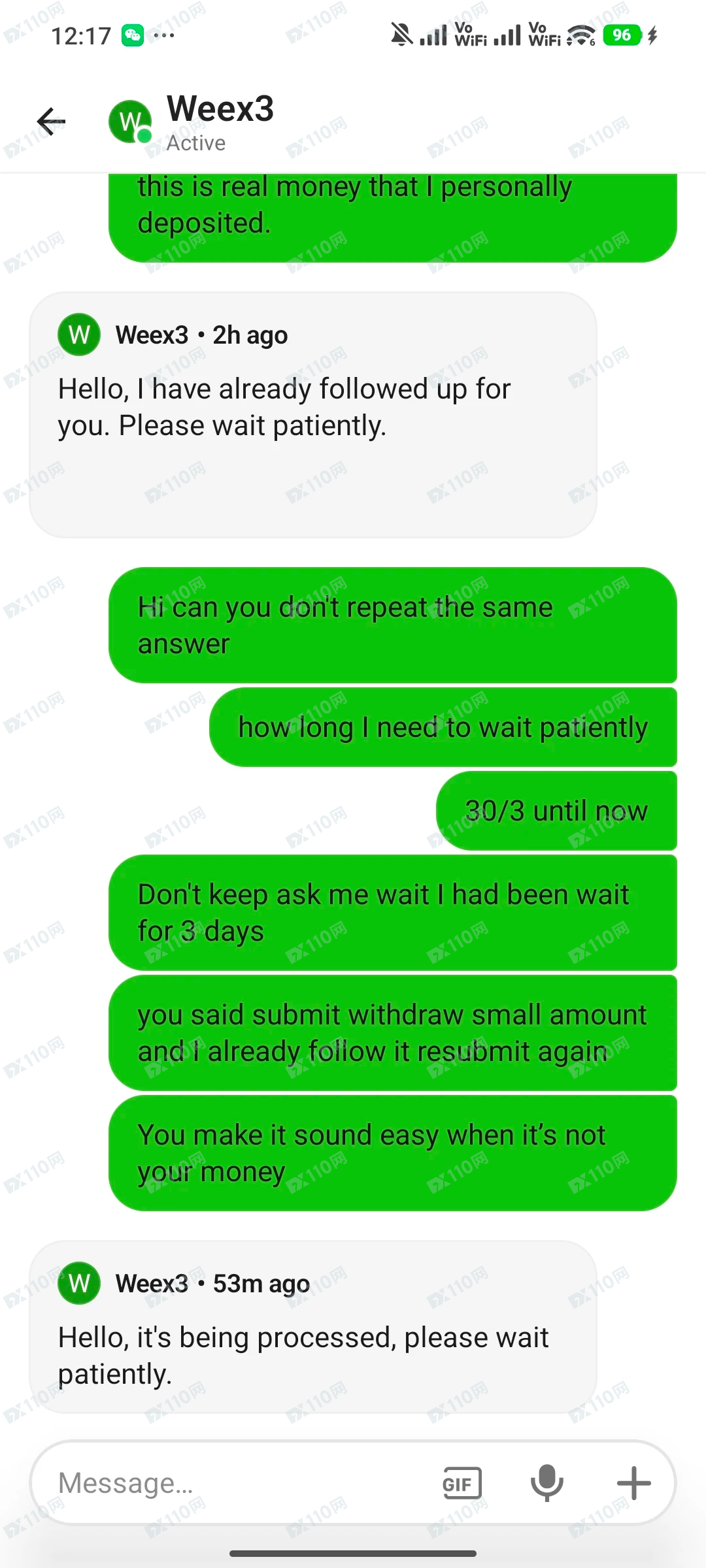 这几天我反复联系客服,对方的回复几乎只有几句话: “please wait patiently” “it's being processed” “try making a small withdrawal”