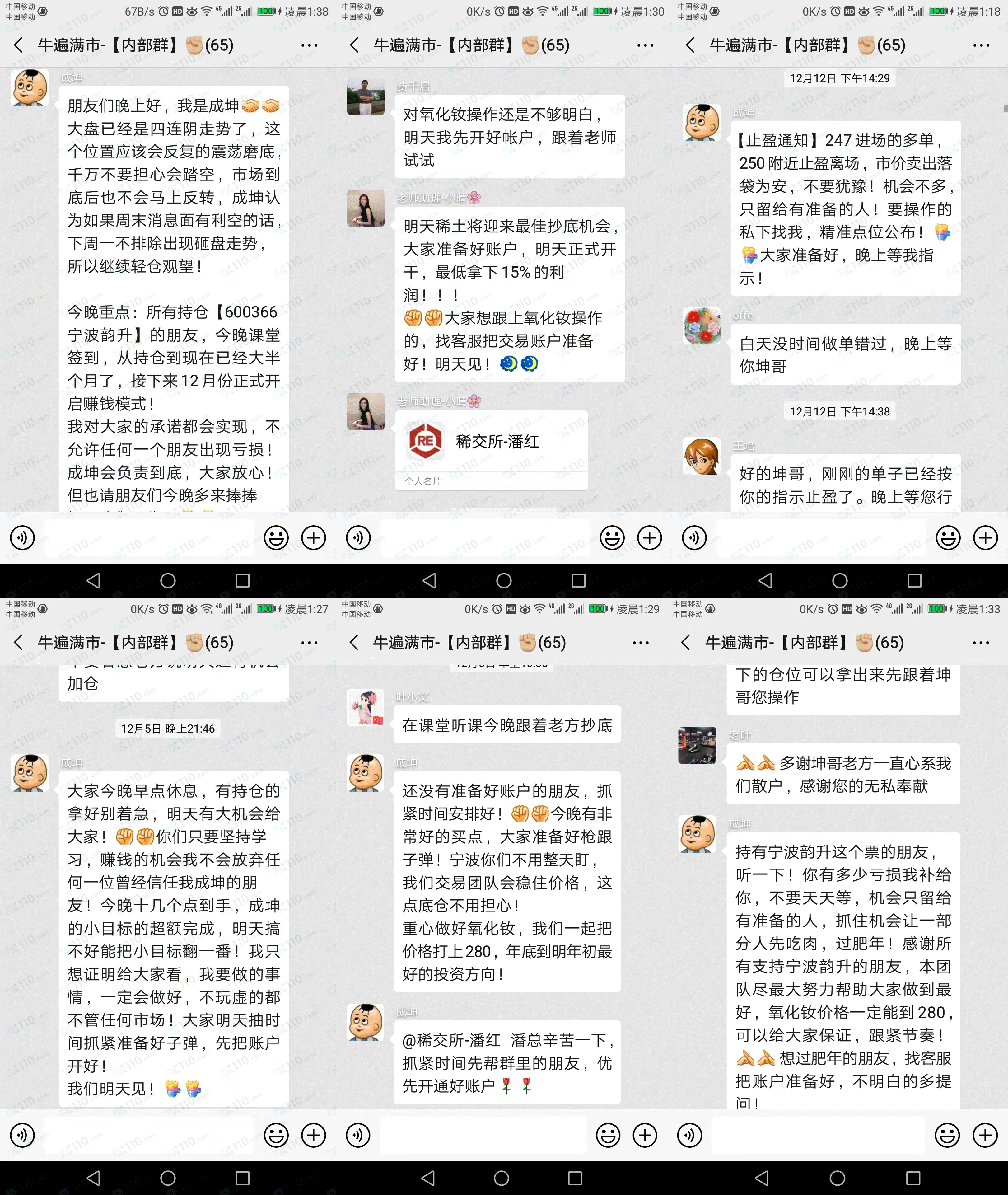 2019年12月初,被人拉入一个股票交流群里,群主每天在直播间讲课,刚开始每天都是分析股票行情,推荐大家买入【宁波韵升】这只票,结果很多人买了就被套,这时老师就说一定负责帮大家赚回损失,现在股票行情不好,强行拉升没有承接盘,说可以通过炒作稀土氧化钕这种原材料,推高原材料价格,从而拉升相对应A股的股票价格。