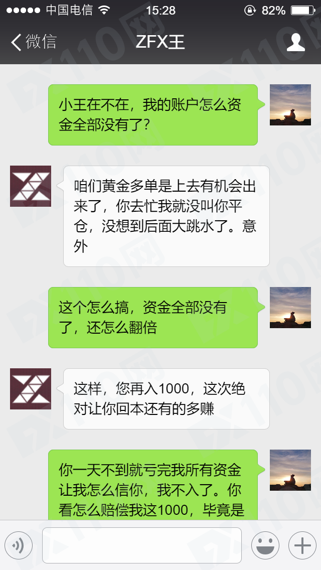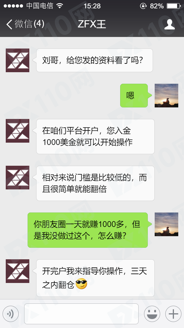 zfx外汇平台山海证券的业务员通过金融群加我好友,期间一直引诱我开户入金,吹嘘入金1000美金便有机会翻倍,盈利非常轻松没有跟我提任何有风险的提示,聊了一段时间过后在平台开户入金了1000美金打算试试,但没想到才下一单这1000美金在zfx业务员的指导下全部亏完,希望平台能给把诱骗我的资金赔偿给我,严惩这种不负责任的业务员。